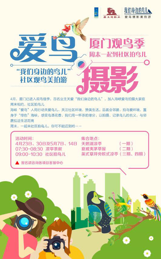 中肯全程參與,活動(dòng)以獨特視角——社區的“鳥(niǎo)兒”展開(kāi),從社區愛(ài)鳥(niǎo)攝影征集活動(dòng)開(kāi)始,成立愛(ài)鳥(niǎo)協(xié)會(huì ),歷經(jīng)茶敘、美拍游、吉祥物推選和邀請小朋友觀(guān)鳥(niǎo)、攝影大賽等一系列活動(dòng)。熱烈反響,網(wǎng)絡(luò )評比活動(dòng)共有來(lái)自全球20多個(gè)國家, 12萬(wàn)人的積極參與。
