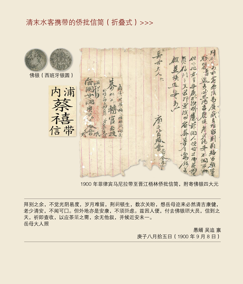 “僑批”又稱(chēng)“番批”或“銀信”,是指海外華僑華人通過(guò)民間渠道(包括后期民間金融、郵局機構)寄給家鄉眷屬附有匯款的書(shū)信以及國內寄往海外回批的合稱(chēng)。